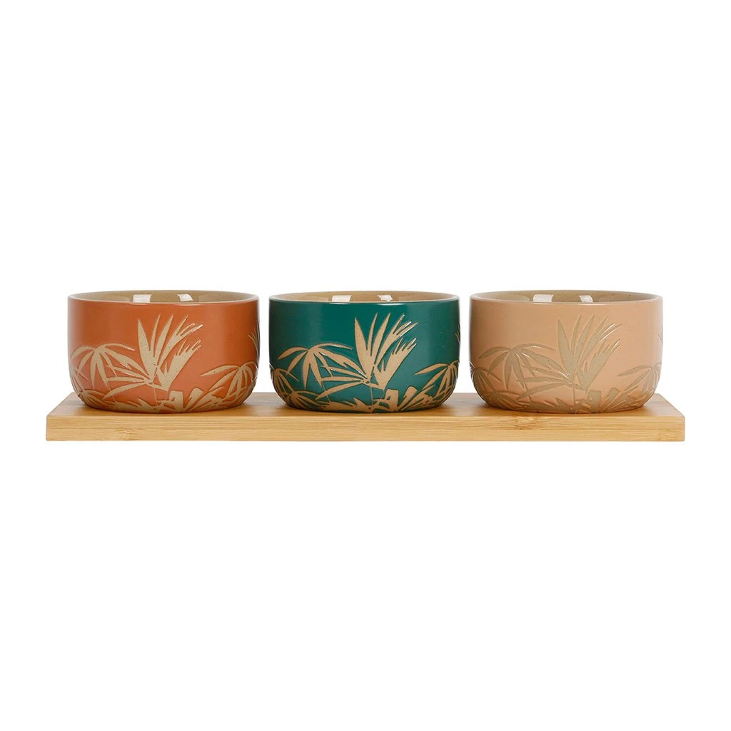 Venez découvrir notre Coupelle x3+plateau sweet leaves emeraude+terracotta+corail d9xh5.5+30x9cm gres+bambou de la marque SEMA Design à découvrir sur Fabrique de Styles.